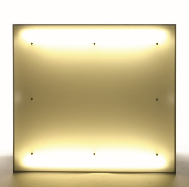 Banco reception in alluminio e trespa con ripiano interno e pannello frontale in plexi retroilluminato, design Jan Vandepitte