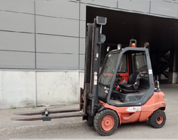 Il carrello elevatore diesel con bilancino con con portata fino a 3000 kg è provvisto di forche e operatore.
